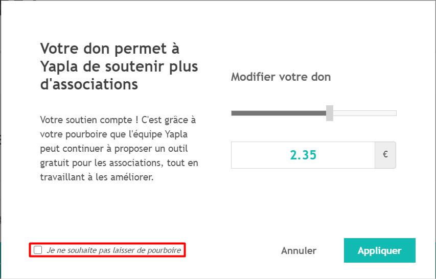 Attention ! Yapla est une plateforme gratuite qui fonctionne grâce au pourboire qui sont activé par défaut, mais vous pouvez si vous le souhaitez le retirer. Pour cela, il vous faut :